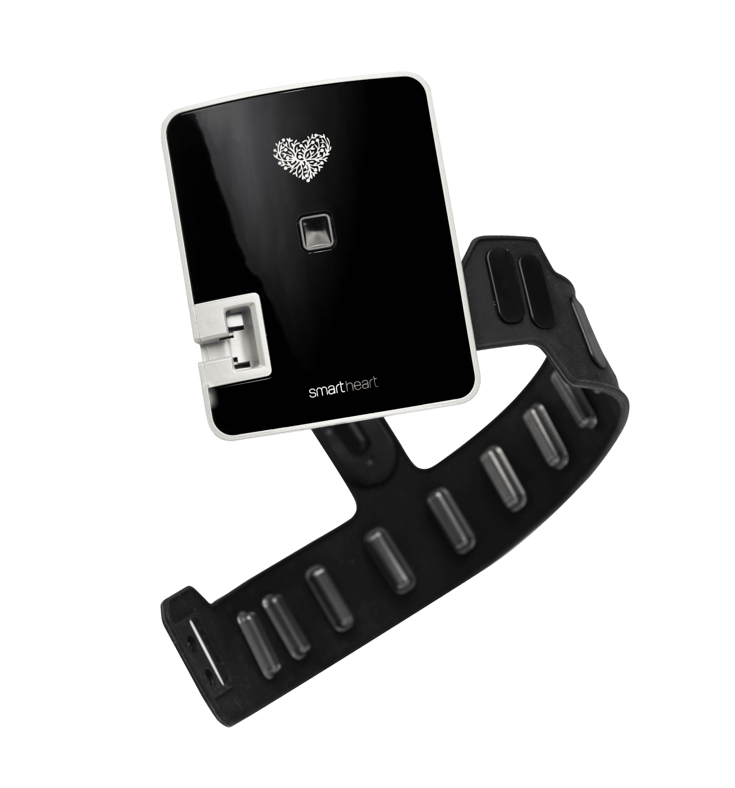 Place SmartHeart against the center of the chest. On men, the device should be ½ an inch below each nipple. Women should place the SmartHeart under the breasts, as high up as possible. Tighten the belt, positioning the electrodes on moistened areas.